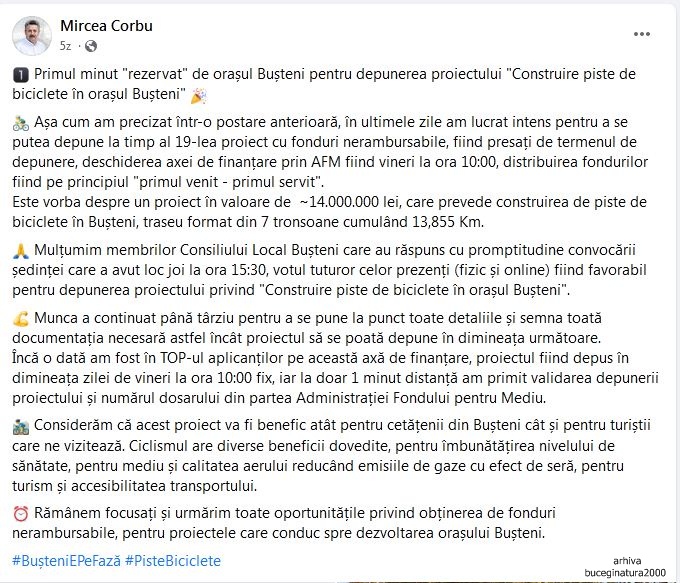 In urma cu cateva zile primarul Busteniului, d-l Mircea Corbu anunta public depunerea unui proiect in vederea obtinerii de finantare pentru realizarea unor piste de biciclete la Busteni.