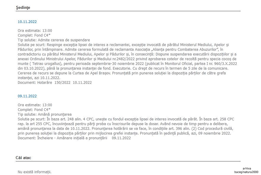 Astazi, Curtea de Apel Brasov a suspendat ordinul, deci nu se mai pot vana cocosii de munte, care nu se mai vanasera de vreo 10 ani. „Toata lumea” spune asta dar putini spre nimeni prezinta si dovada: