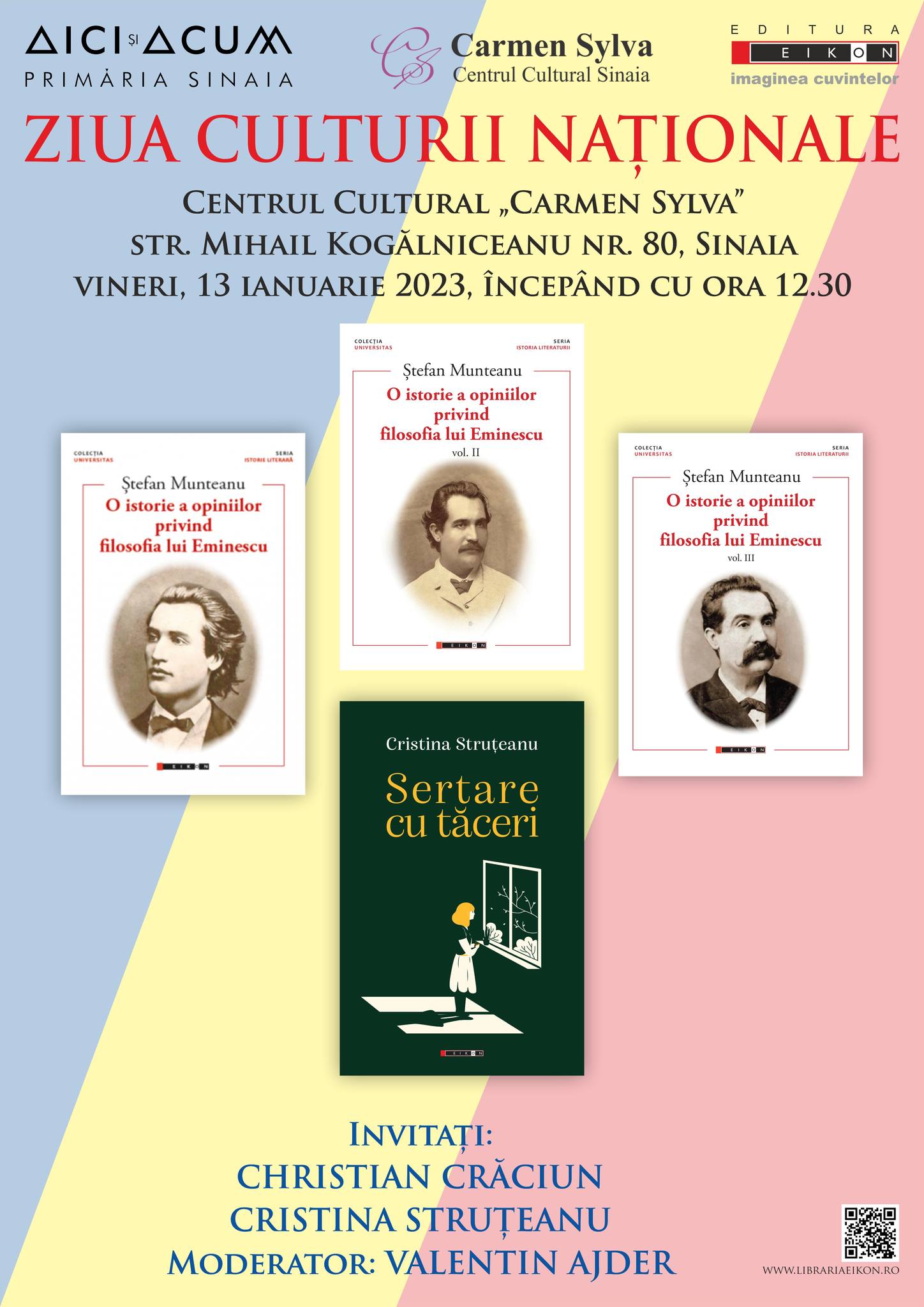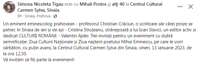 Eveniment Sinaia despre Eminescu Publicat de buceginatura2000 on ianuarie 12, 2023 Eveniment important maine la Sinaia… la Centrul Cultural „Carmen Sylva”. Se anunta lansarea unor carti dar si prezenta multor invitati cunoscuti: Partajează prin WhatsApp(Se deschide într-o fereastră nouă) WhatsApp Trimite unui prieten un email cu o legătură(Se deschide într-o fereastră nouă) Email TweetApreciază Încarc... Similare