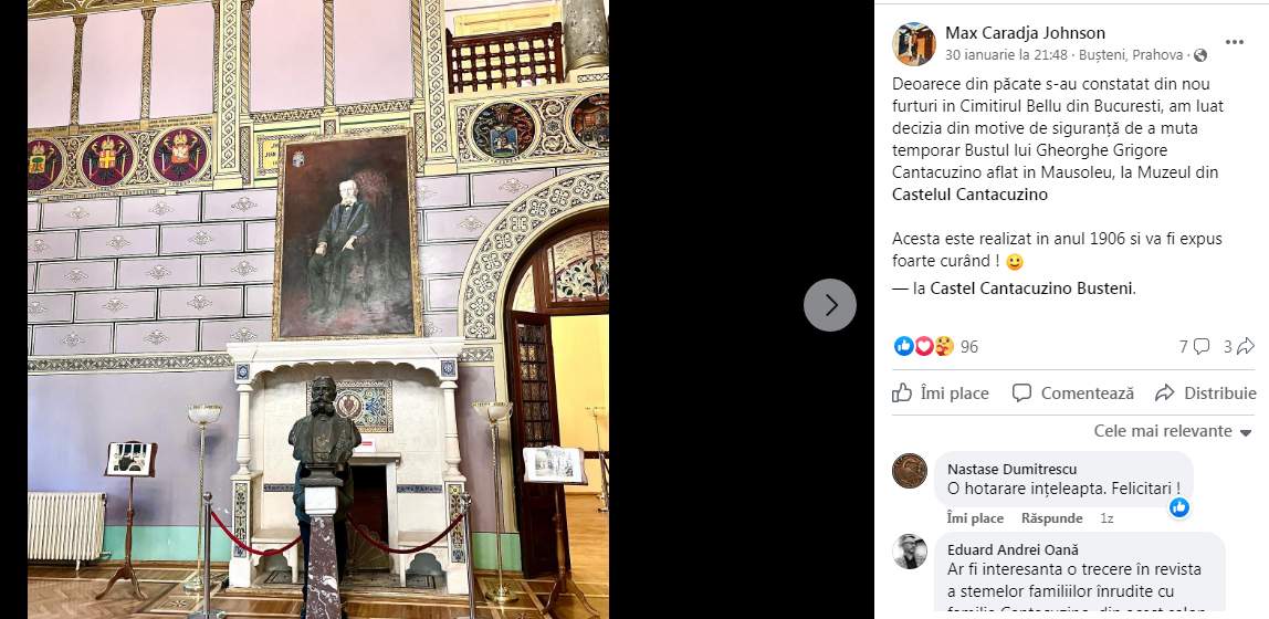 O stire chiar interesanta… ONG-ul Caradja Cantacuzino a anuntat pe Facebook ca la castelul Cantacuzino din Busteni va fi expus bustul printului Gheorghe Grigore Cantacuzino zis „Nababul”.