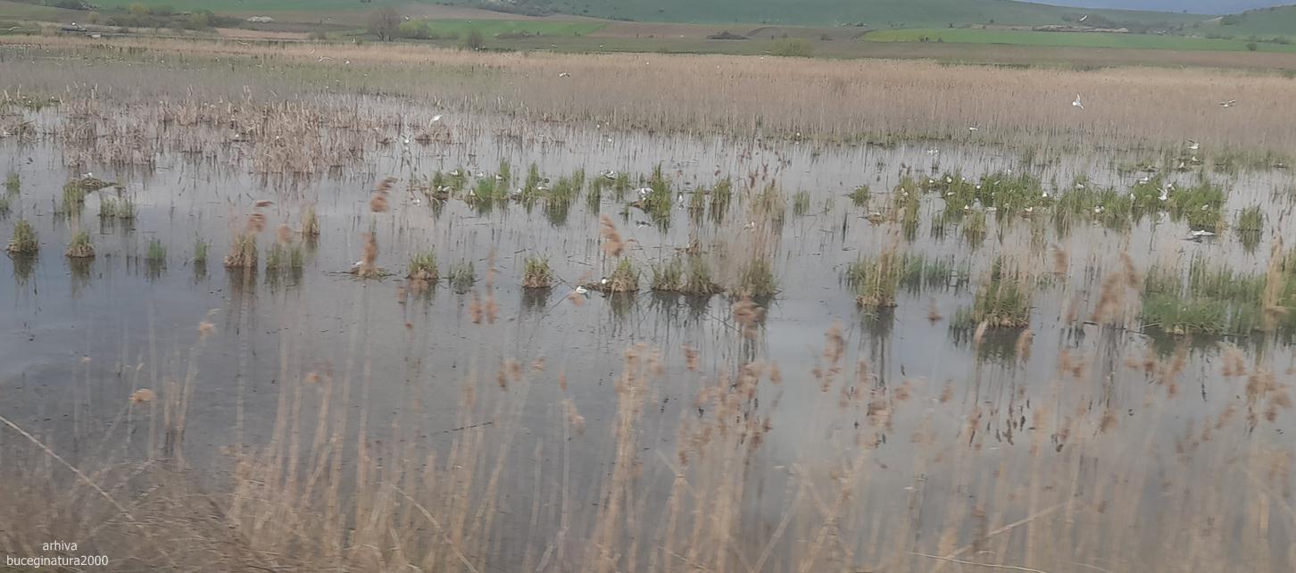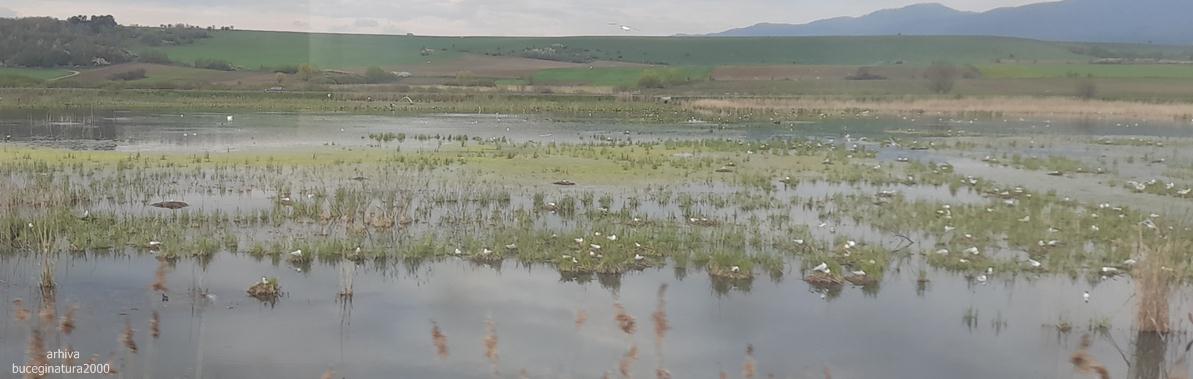 Un lac vazut din tren pe care erau multe specii de pasari din care unele cuibareau.