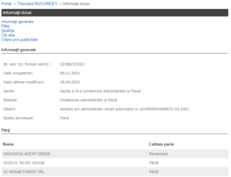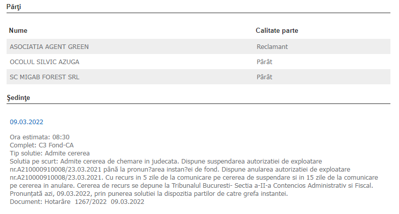 Ocolul silvic da periodic spre exploatare zone impadurite unei societati. Ghinionul astora, la Migab ma refer, super profesionisti in scosul rapid al lemnul din padure si al realizarii drumurilor de exploatare, a fost ca nu stiu cum au dat peste Agent Green. Sau Agent Green a dat peste ei. Migab avea de taiat padure si Agent Green a contestat actul de taiere in instanta. Asta era in 2021, actul de exploatare fiind din 23.03.2021.