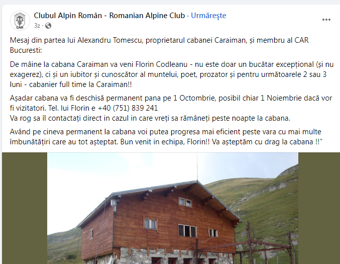 Iesim la cabana Caraiman a violonistului Alexandru Tomescu. Pe Facebook a fost publicat numarul de telefon pentru cazare: