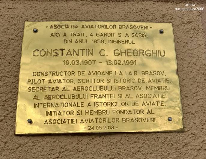 In amintirea unui mare aviator, Constantin Gheorghiu (1907-1991), pilot, scriitor si istoric de aviatie. Placa amplasata de Asociatia Aviatorilor Brasoveni in anul 2013.