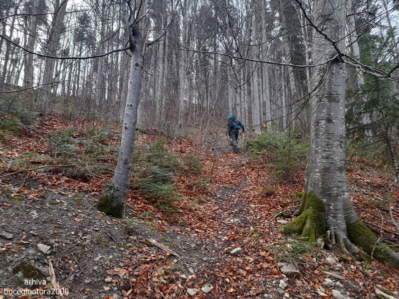Si iesim totusi in traseul hotilor dupa o ora si jumatate de urcus. De aici, o luam asa prin tufe, pe curbe de nivel, mai urcam pe cate un fir de vale…