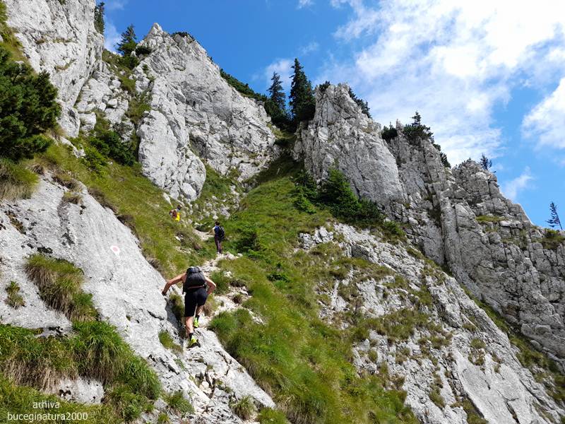 Plecam de la cabana urmand punctul rosu, nu inainte de a ne intalni cu Pepi Tilea care se afla intr-o ascensiune solitara. El ne-a intrebat daca ne-am luat placinte, noi nestiind ca acolo sunt placinte cu ravas. Ne-am propus sa devenim clienti la intoarcere pentru acest lucru :))