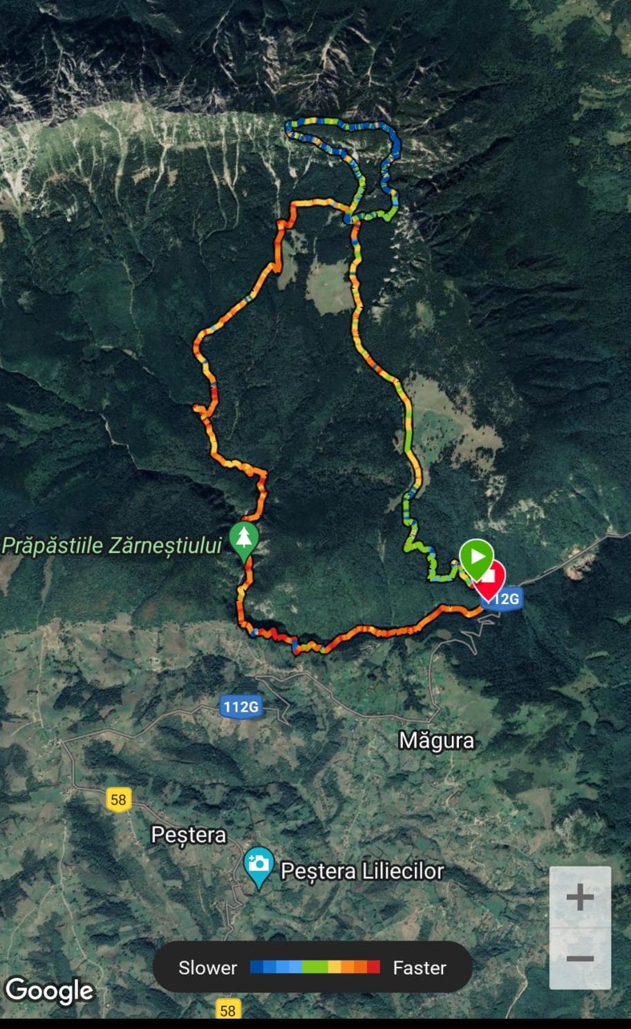 La plecare nu folosim niciun traseu de picior spre Prapastii, adica nici punct galben, nici banda albastra si o luam efectiv pe drumul auto. Era ora 15 la 16:35 eram la masina.