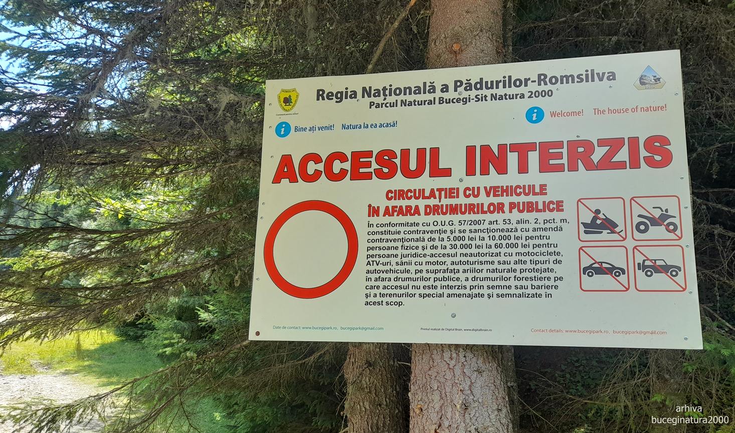 Pe la jumatatea drumului aproximativ, putin mai sus de ce s-a vrut a fi cabana Podu cu Flori, este acest panou care interzice tranzitul auto. Am vazut de 2 ori o masina a Jandarmeriei pe acolo. Acum nu stiu daca si dau amenzi. Personal nu cred dar nu va bazati pe ce cred eu :)) Poate unii chiar isi fac treaba, cine stie :)