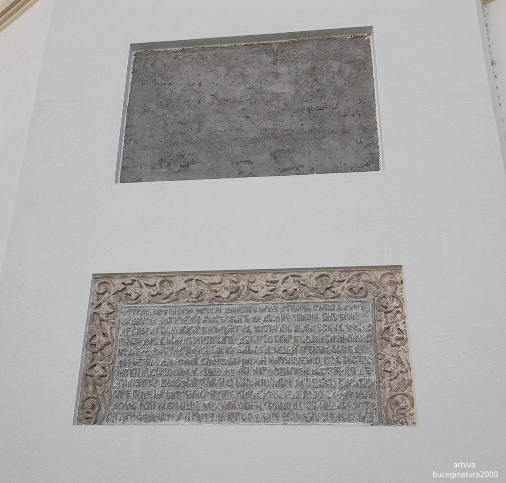 Pisania este afara prinsa in zidul exterior. Posibil ca mai sus sa fie adaugata o alta.