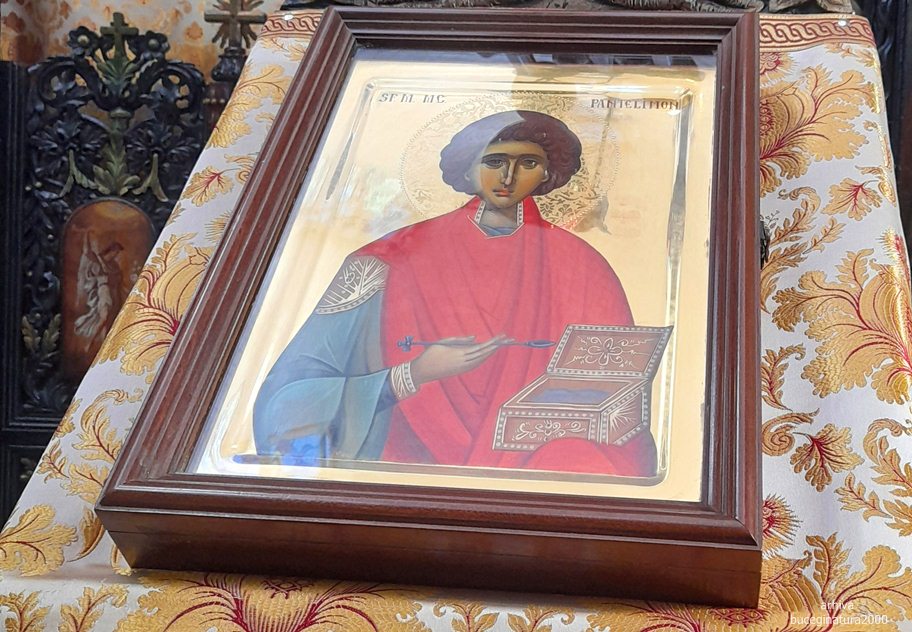 Icoana Sf. Pantelimon. In biserica sunt moaste ale acestui sfant.