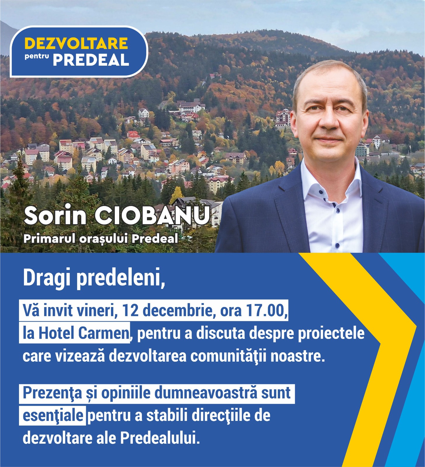 Saptamana trecuta, vineri, pe 12 decembrie 2025, primarul orasului Predeal, d-l Sorin Ciobanu s-a intalnit intruna din salile de sedinta din hotelul Carmen**** cu localnicii interesati din Predeal.