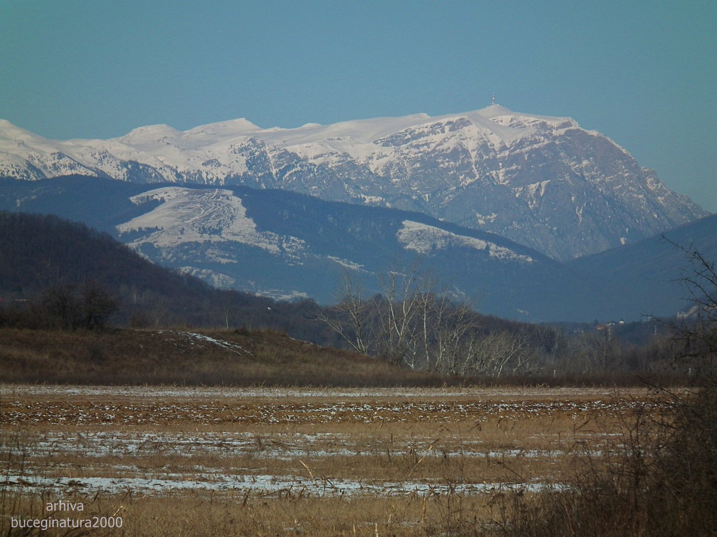 Poiana mare din fata este de fapt…muntele Plesuva de la Comarnic, cel cu steagul. Pe fundal, evident, Bucegii…