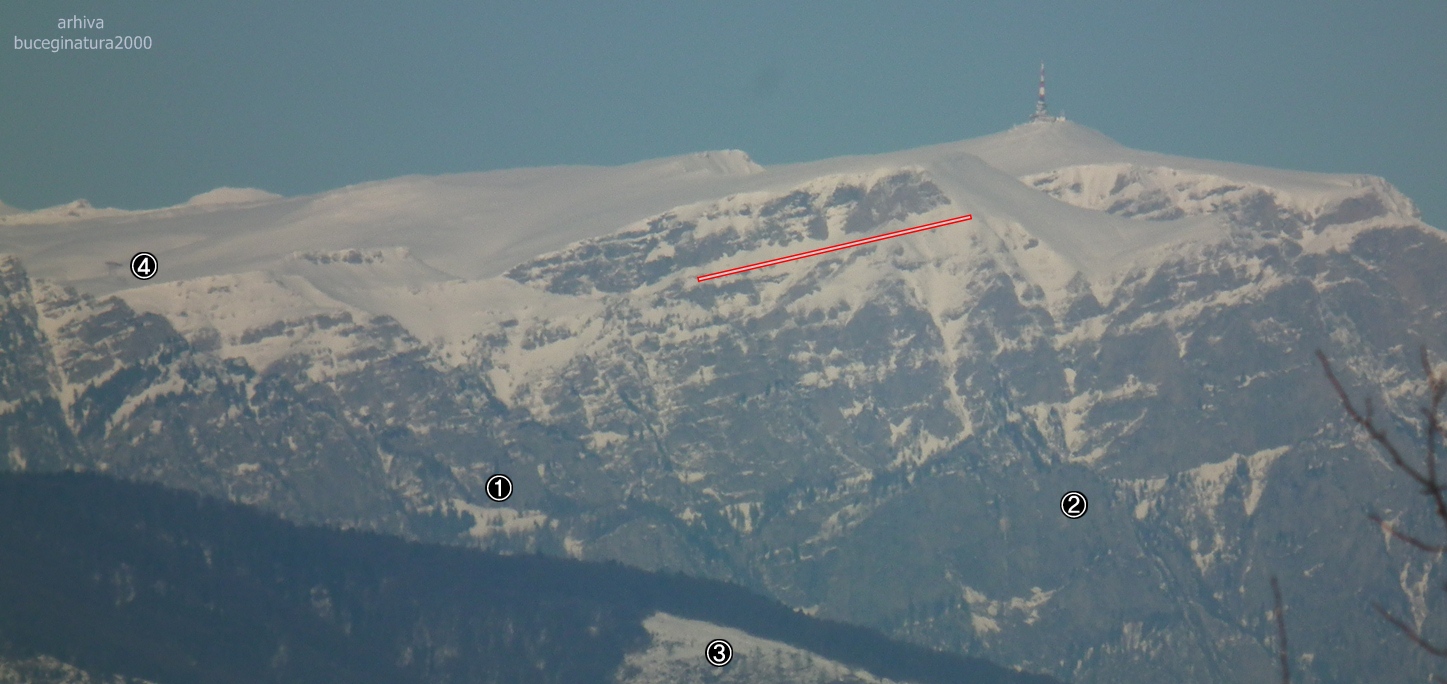 Cu linie rosie… brana mare a Caraimanului, cifra 3 – Plesuva Mica, se urca din Posada, cifra 2 – Claia Mare, cifra 4 – un stalp al telecabinei Busteni-Babele, cifra 1 – Saua Urlatorilor (pe traseul turistic de pe Jepii Mari)…